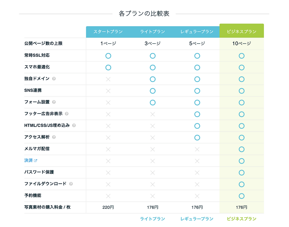 (「広告表示が行われない」、「制作したページに独自のドメインを設定できる」の要件がライトプランだと満たすことができない。) ただし、ライトプランですとページの作成可能数が3ページに制限されますので、もっと多くのページを作成する必要がある場合、一つ上のレギュラープラン、ビジネスプランを検討する必要があります。