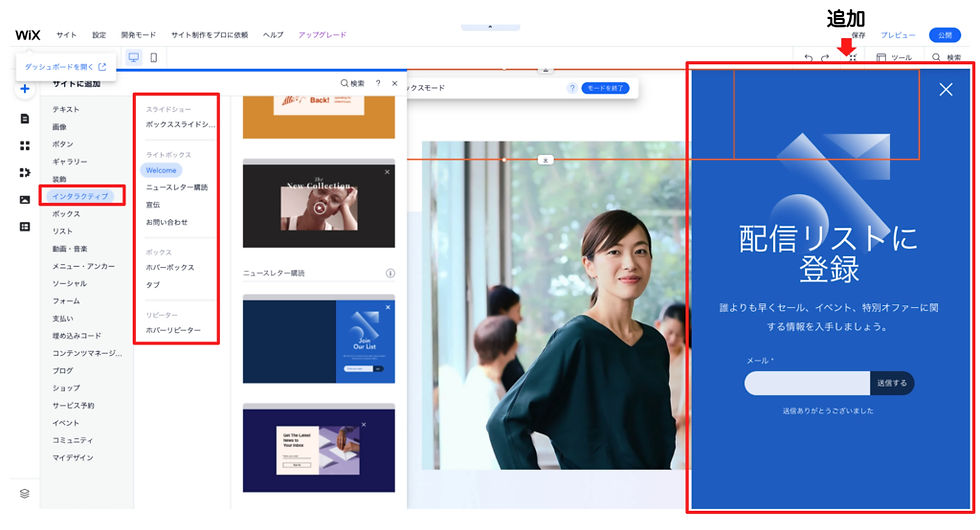 3 . 次にグローバルメニューを表示させるためのポップアップを設定するため「追加ボタン」より「インタラクティブ」を選択したのちお好みの「ライトボックス」を追加