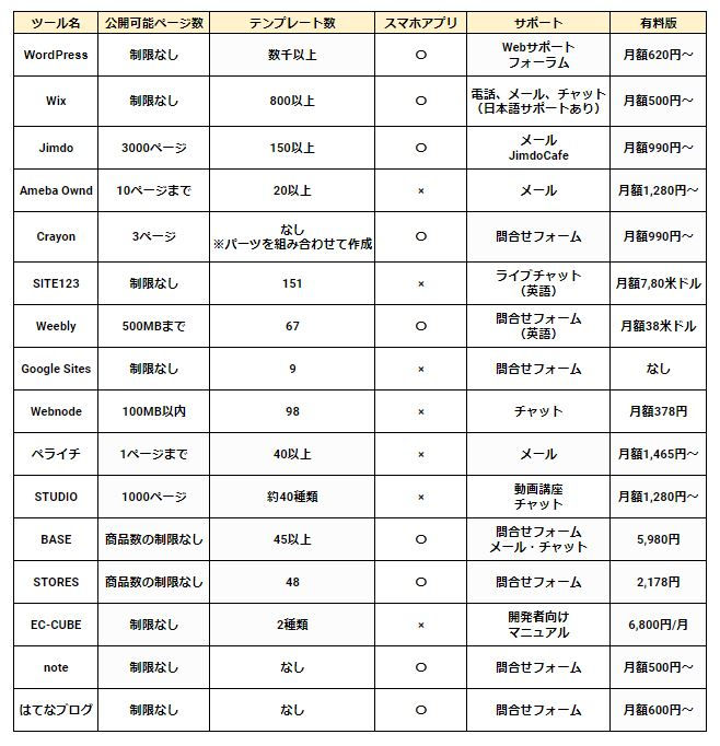 それぞれのホームページ作成ツール別に、サービス内容を詳しく解説していきます。