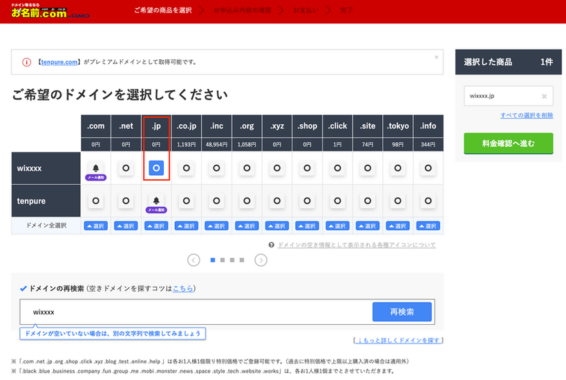取得したいドメイン名を選択する