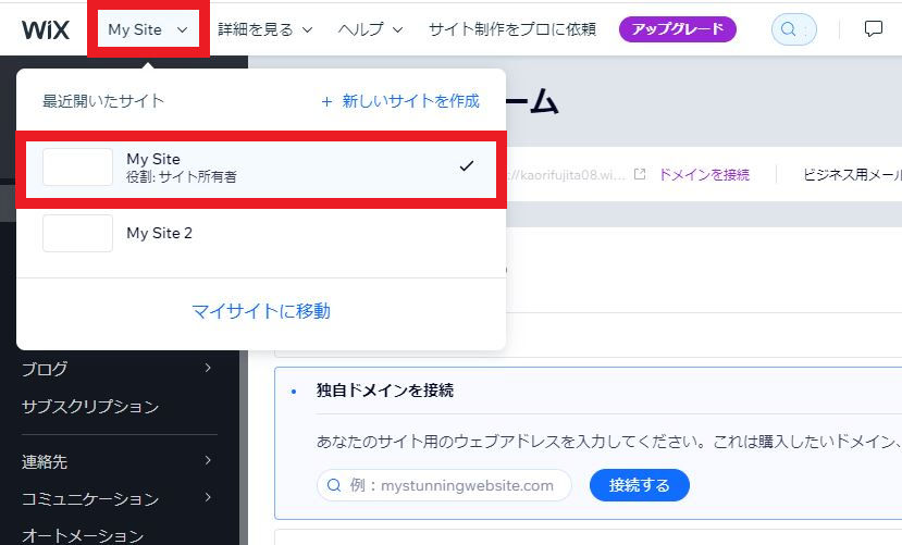 Wixの管理画面より、左上の「マイサイト」をクリックします。