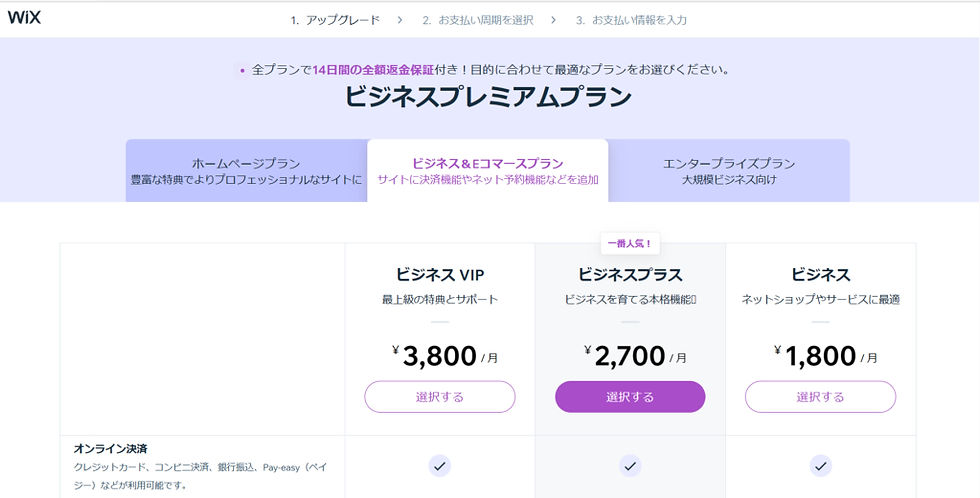 Wixのプレミアムプランは14日間の全額返金保証がついているため、間違って購入したとしても安心です。