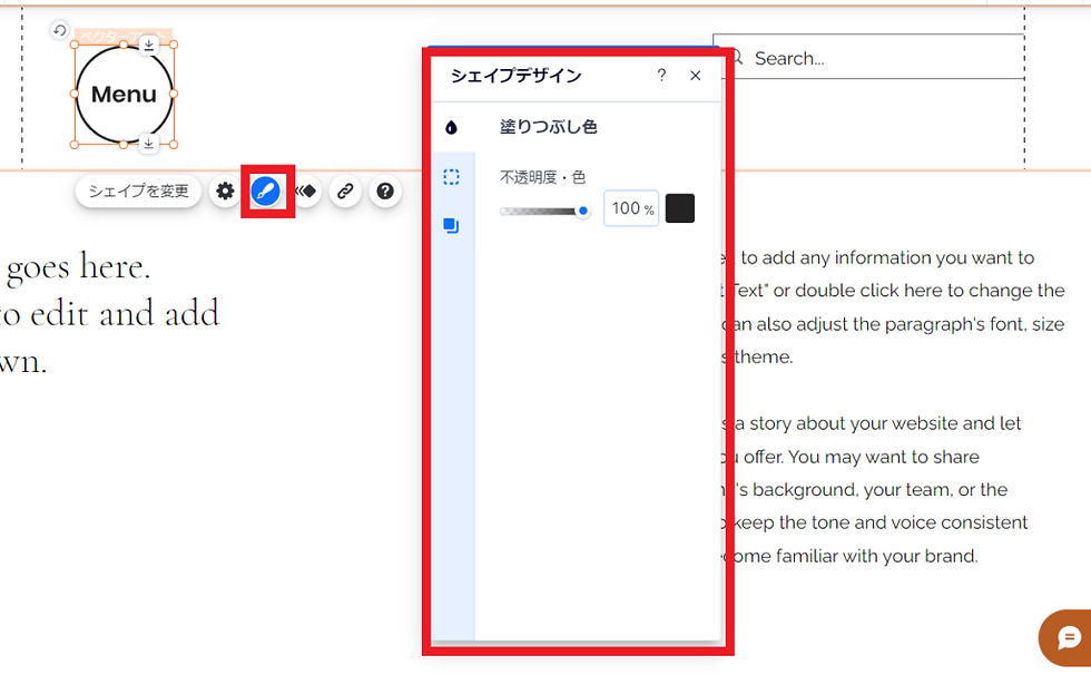 ⑥エディタでメニューボタンを選択し、「デザインを変更」アイコンをクリックし、メニューボタンをデザインします。