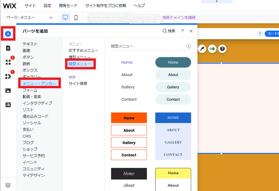 ⑤メニューボタンのデザインを選択し、「ページに追加」をクリックします。 メニューボタンは、ヘッダーなど、サイトの目立つ場所に配置しましょう。